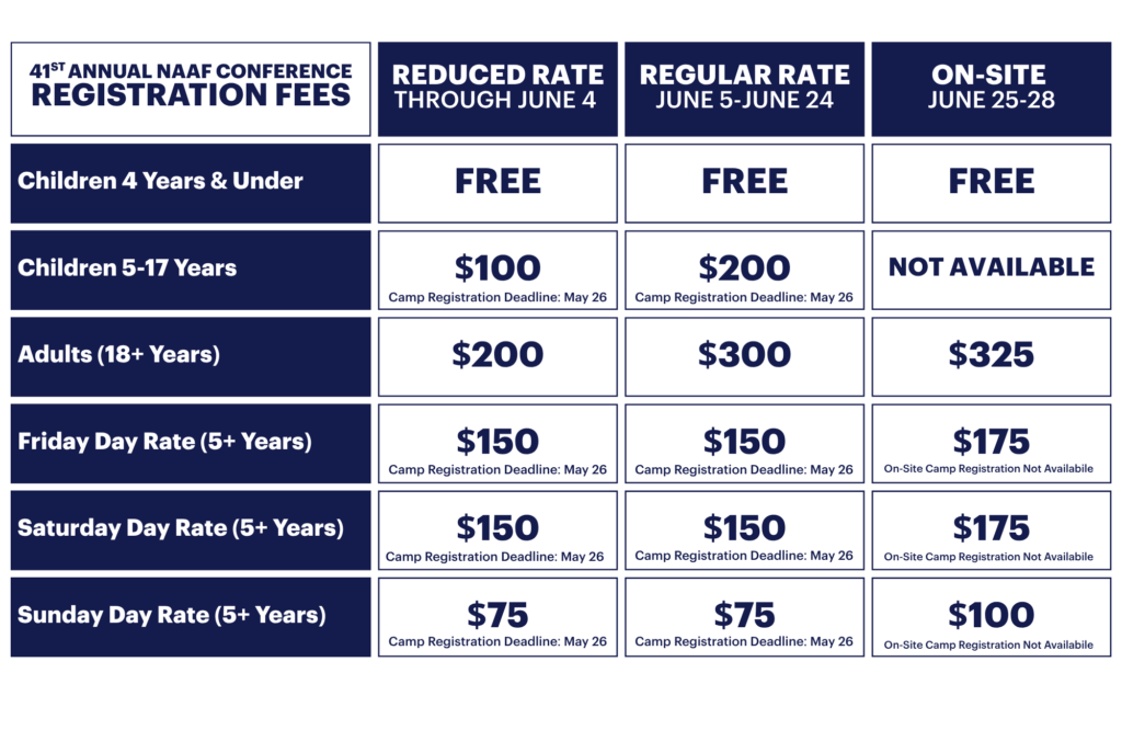 REGISTRATION IS NOW OPEN! Join us on June 25-28 in Orlando for the 41st Annual NAAF Conference, the largest gathering of the alopecia areata community in the world! Whether you are newly diagnosed, have lived with alopecia areata for some time, are seeking support, or want to learn more for a loved one, this conference is for you. Register Today! Book Your Hotel Stay New for 2026! The 41st Annual NAAF Conference will feature new and enhanced programming based on feedback from our community, including sessions for: Individuals with skin of color living with alopecia areata Young adults with alopecia areata aged 18-30 years old Parents of children with alopecia areata Community members living with mild to moderate alopecia areata Youth Camp* attendees The Preliminary Conference Program can be found here (subject to change). Registration Fees Exhibitors We welcome exhibits from pharmaceutical companies and other businesses with FDA-approved treatments for alopecia areata, as well as companies and individuals offering books and educational materials that empower people living with alopecia areata, wigs and headscarves, and cosmetic solutions designed to support day-to-day living with alopecia areata. To ensure a balanced and diverse exhibitor experience for attendees, the National Alopecia Areata Foundation (NAAF) limits the number of exhibitors within each business category (e.g., a maximum number of wig vendors, cosmetic vendors, and similar product types). Acceptance is subject to availability within each category. Pharmaceutical and biotechnology companies, as well as research institutes, should contact Kris van Osanbrugge, Development Director, at krisvo@naaf.org. All other commercial businesses (including wigs, headscarves, and makeup/camouflage providers) and individuals interested in exhibiting at the NAAF Annual Conference must complete a 2026 Annual NAAF Conference Exhibitor Agreement and Application. Space is available on a first-come, first-served basis and is contingent upon category availability. Sponsorship Opportunities Please contact Kris van Osanbrugge, Development Director, at krisvo@naaf.org, if you are interested in sponsorship opportunities for the Annual NAAF Conference. Change a Life Today Want to share the powerful experience of the patient conference with a member of the alopecia areata community for whom cost is an obstacle? Generous donations from friends like you have made it possible for more than 2,000 individuals with alopecia areata to attend this conference over the past 30 years. You can change a life today by making a gift to our financial assistance fund that will provide the help, hope, and sense of belonging that comes from attending the conference. No matter what amount you are able to give, we are grateful!. Make a Donation Questions? Contact us at conference@naaf.org. All You Need To Know About The 41st Annual NAAF Conference: Conference: Hotel Conference: Preliminary Program Conference: Speakers Conference: Youth Camp Conference: Attendee Info Conference: Ambassador Program Conference: FAQs Conference: Call for Presentations Thank You To Our Sponsors Platinum Sponsors Gold Sponsor